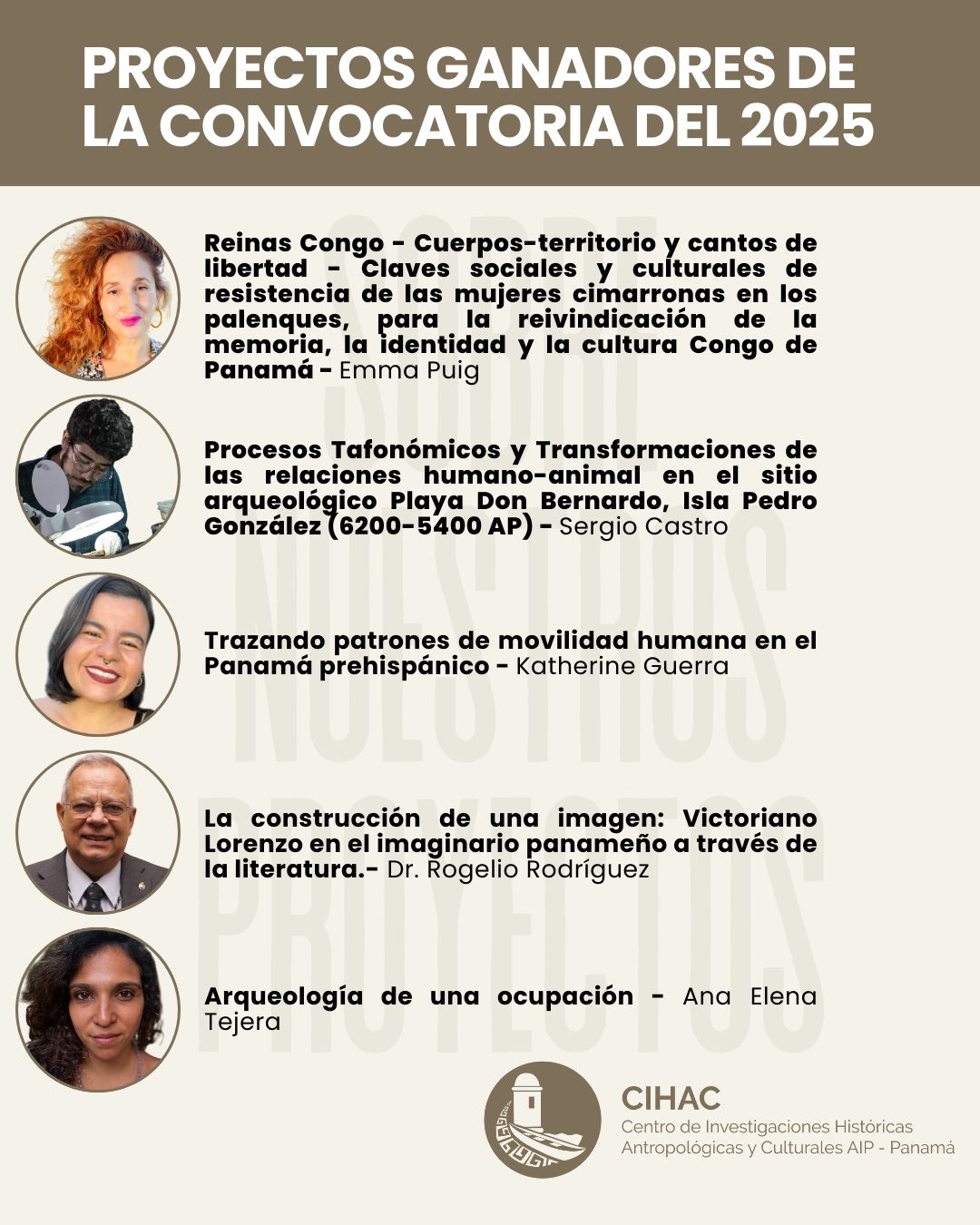 El programa de Investigadores Visitantes del CIHAC AIP es una plataforma para que investigadores en diversas disciplinas realicen proyectos de investigación de entre 3 y 6 meses, a cuyo término se entrega una contribución al conocimiento sobre el pasado y/o el patrimonio cultural panameños en forma de un producto concreto de investigación.